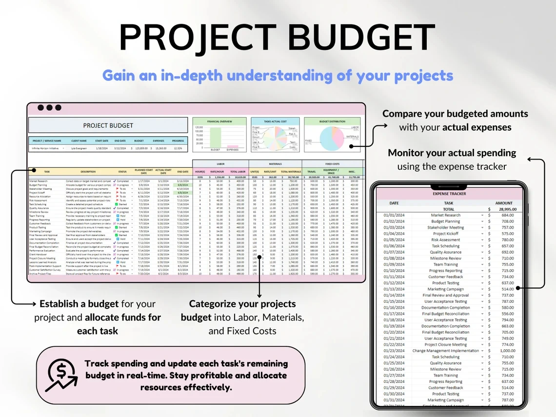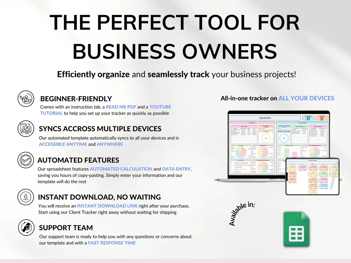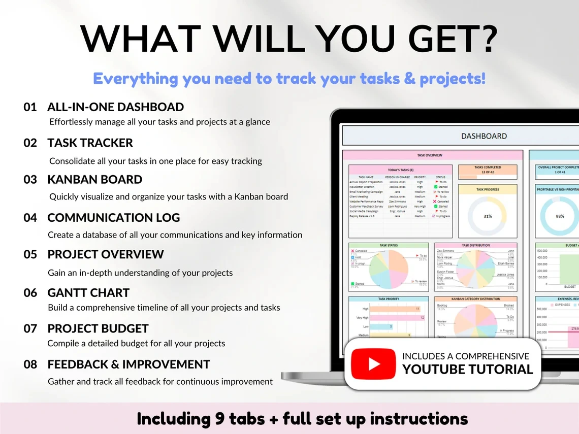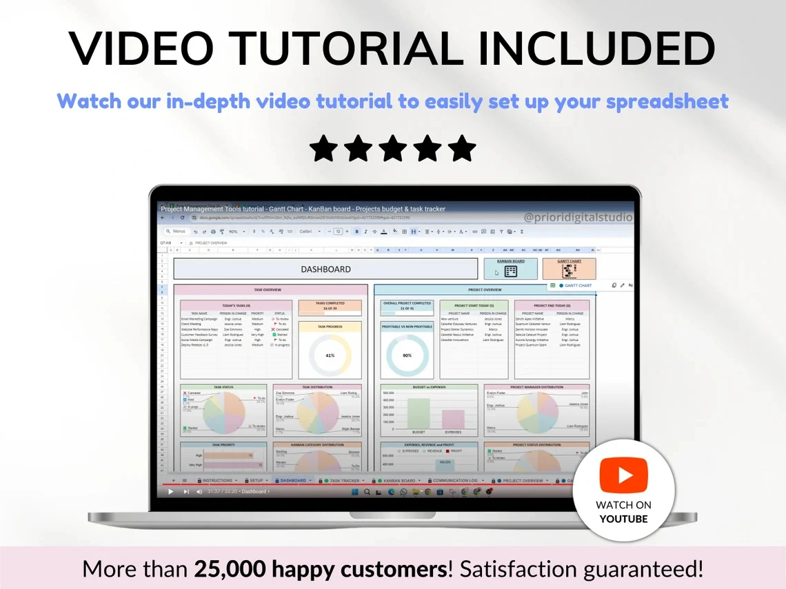 📈 Our Project Management Tools Spreadsheet offers an ideal solution for small business owners seeking comprehensive project management and clear insights into their business performance. Seamlessly monitor tasks with a Kanban board, track project timelines using a Gantt chart, manage budgets and access detailed project overviews.